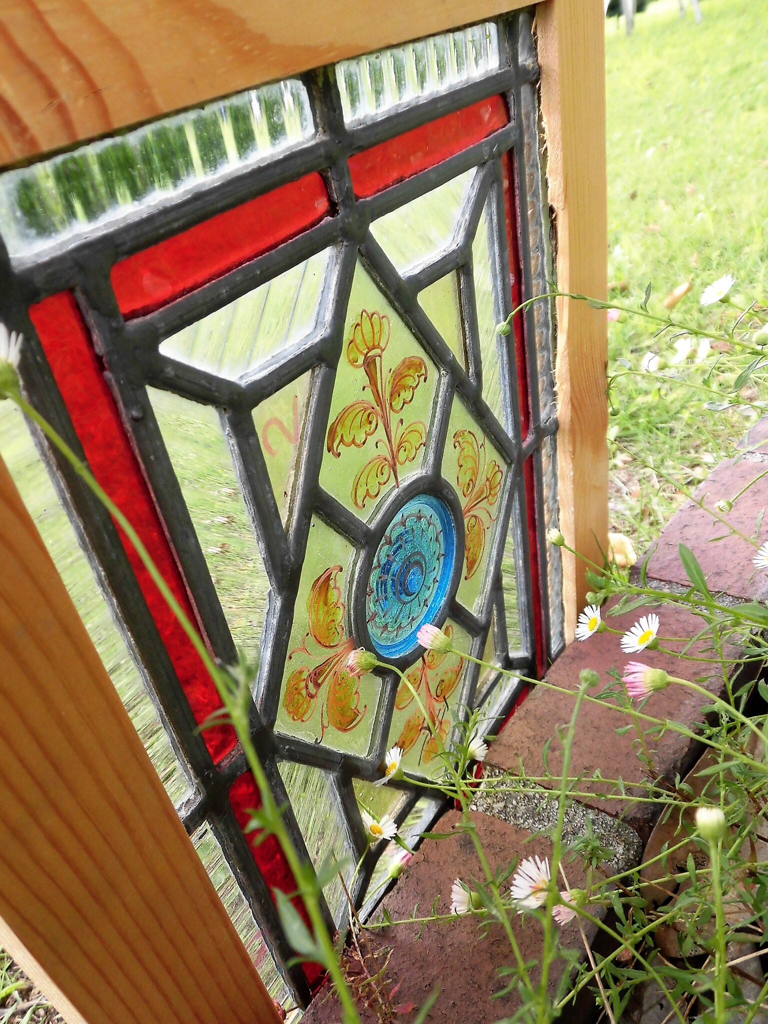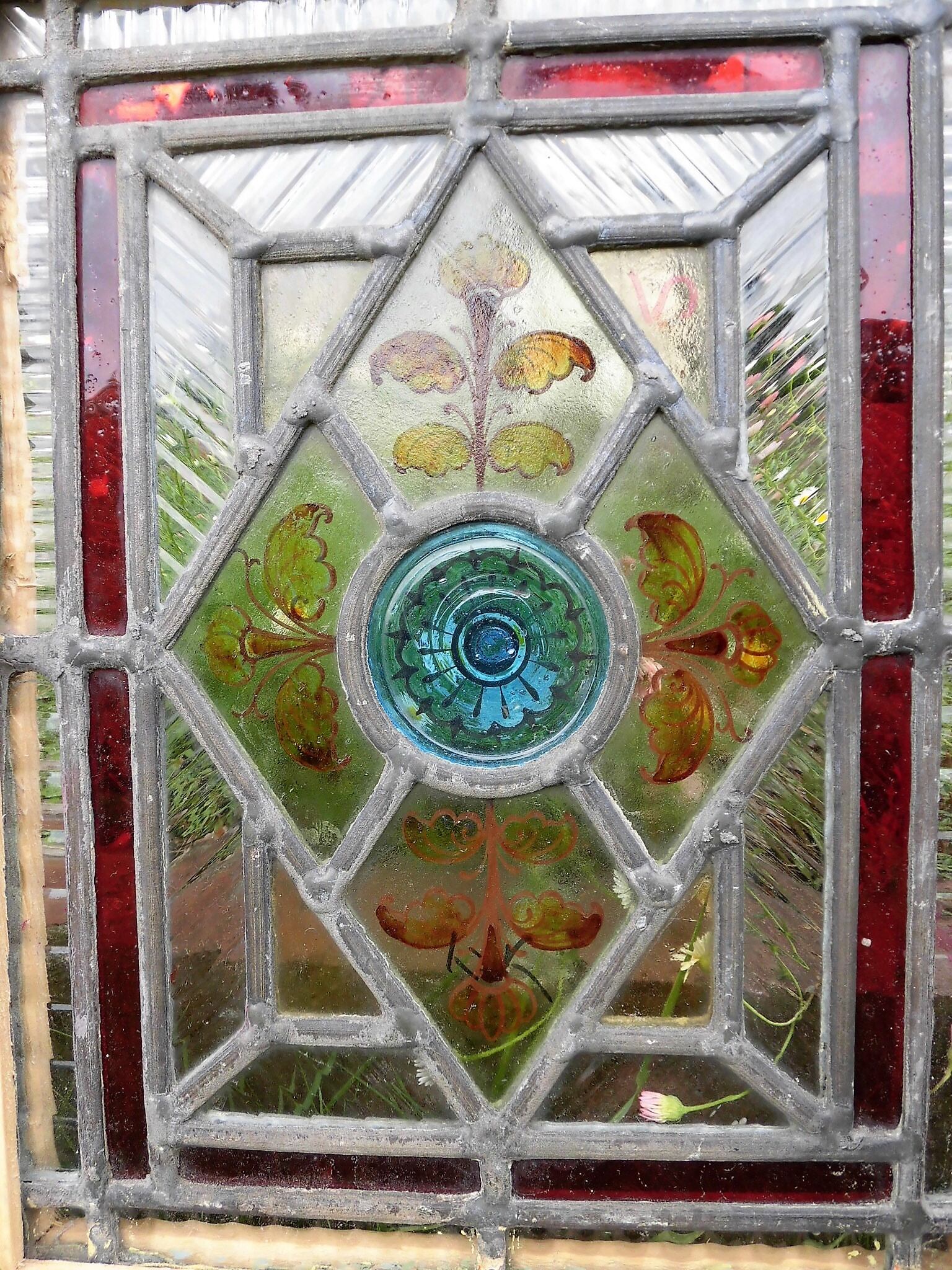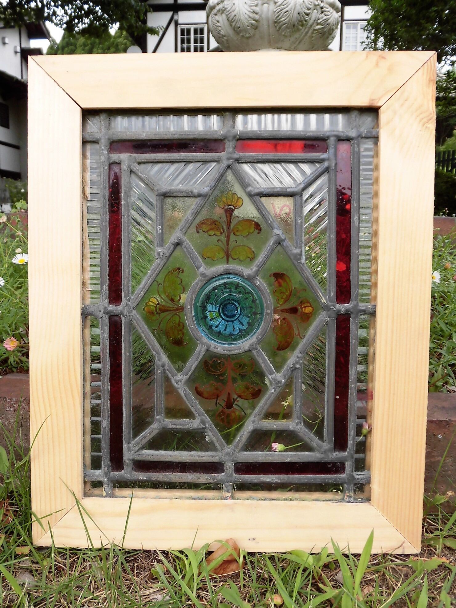 British。 ハンドペイントのステンドグラスです。 中央の丸いガラスは1900年後半のものです。 フレームは後年作り替えてあります。4枚あります。 サイズは、縦32.5㎝、横26㎝、幅4㎝です。