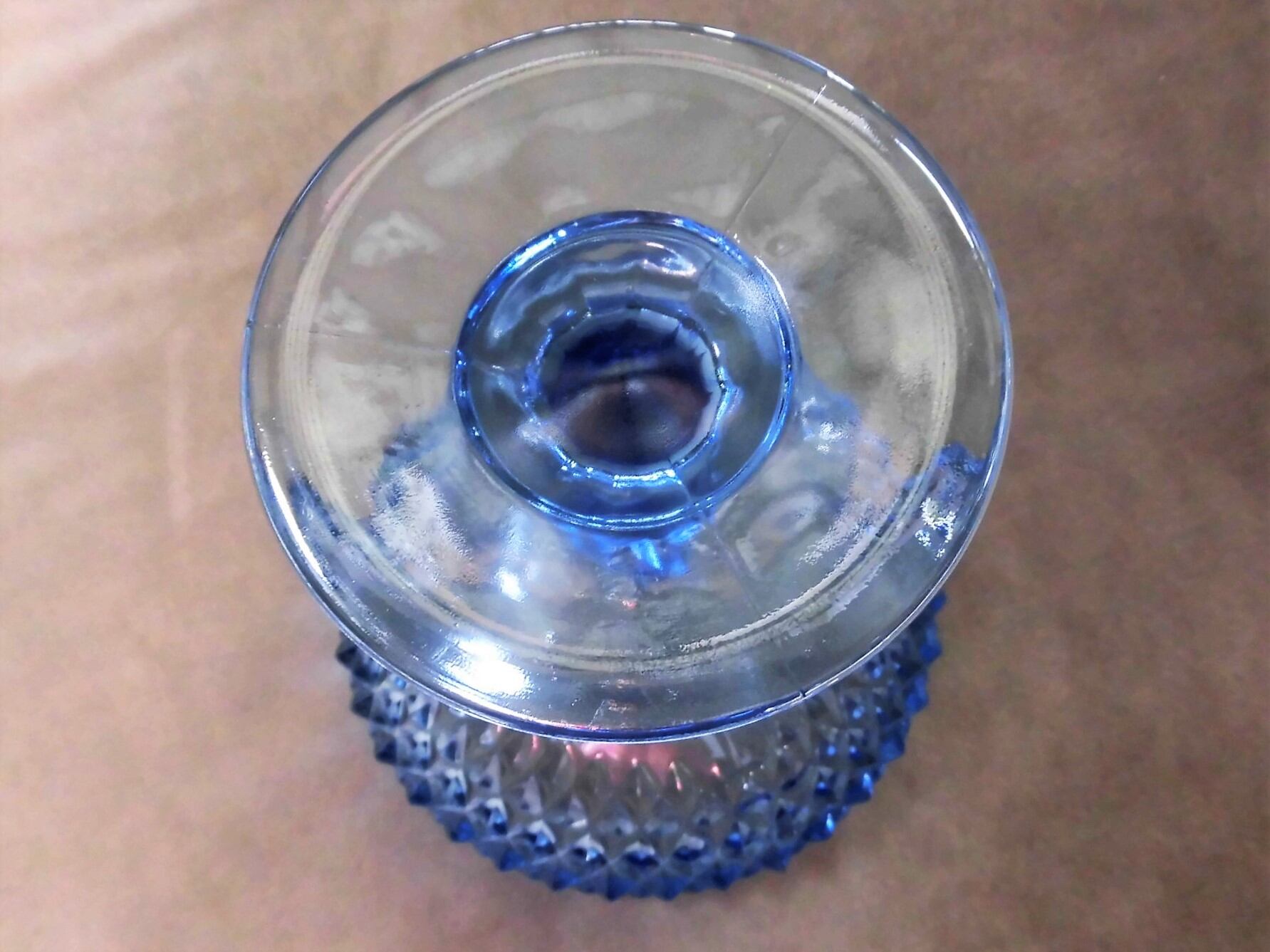 USAディプレッションガラス、ミスアメリカ。 ブルーが爽やかなコンポートです。 幅16.0㎝、口の直径14.5㎝、底の直径9.7㎝、高さ18.8㎝です。